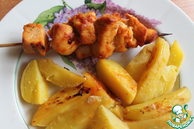 Курицу нанизать на шпажки, выложить на картофель. Запекать при 180 градусах 30-45 минут. Готово! Приятного аппетита!)