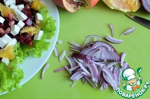 Выложить на свеклу апельсин и зерна граната.