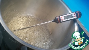 Даю сиропу закипеть и оставляю на огне чуть выше среднего минут на 15. Варю сироп до 120 градусов или до пробы на мягкий шарик.