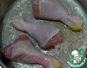 Кладём на сковороду по несколько кусков курицы и обжариваем до золотистой хрустящей корочки. Как только корочка появилась, перекладываем курицу на отдельную тарелку и обжариваем следующую партию.