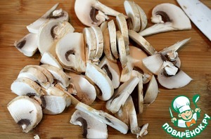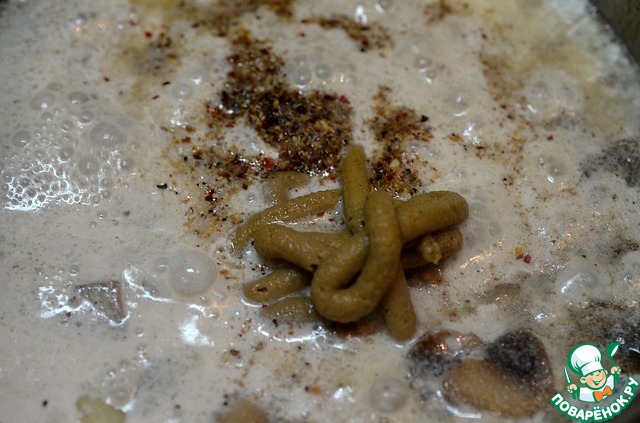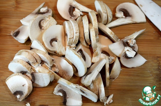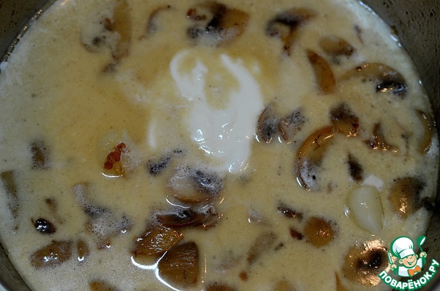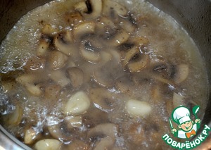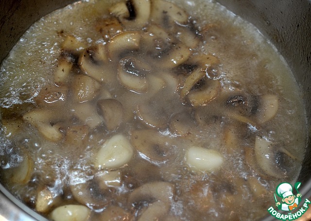 Внесла некоторые изменения в базовый рецепт, потому что кое-чего не оказалось: шампиньоны заменила белыми грибами, куриный бульон - грибным для усиления аромата грибов, белое вино - коньяком