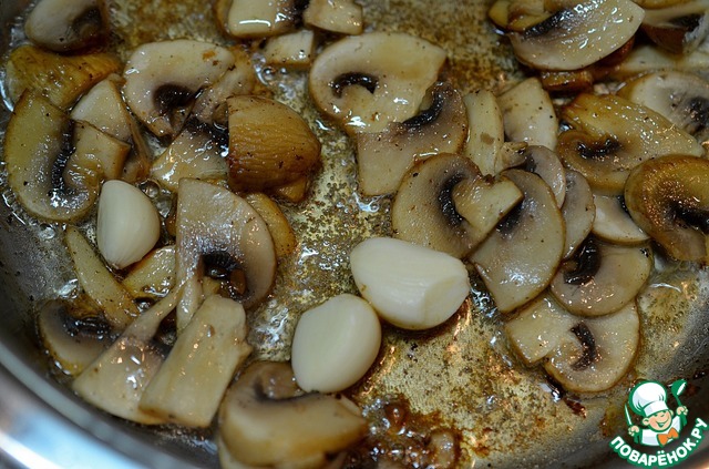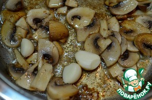 Обжариваем грибы в этой же сковороде минут 5, добавляем чеснок. Обжариваем.