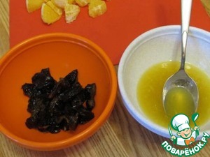 Смешиваем мед и апельсиновый сок. С чернослива слить воду, нарезать на кусочки.