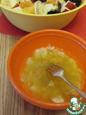 Один банан помять вилкой и добавить к апельсиновому соку, перемешать. Это будет наша заправка.