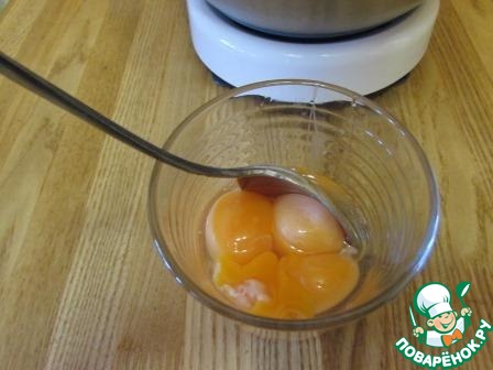 Не прекращая взбивать белки, ввести по одному желтки. В просеяную муку добавить ванильный сахар и порционно ввести в белково-желтковую смесь, вымесить до гладкости.