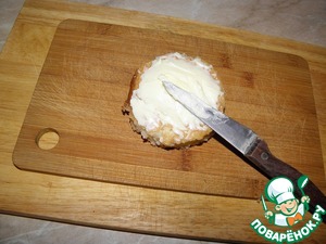 Теперь склеим наши заготовки попарно, промазав кремом. Более нежную верхнюю сторону бисквита спрячем внутрь, а сверху и снизу пирожного будет нижняя часть бисквитного коржа.