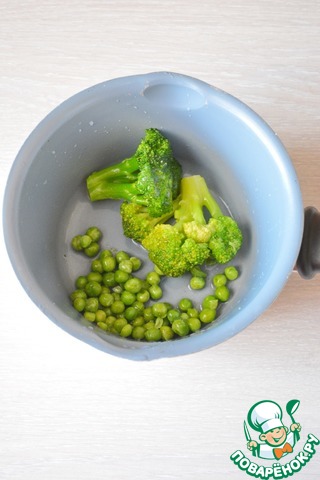 Брокколи и горошек (у меня замороженные) варите 2-3 минуты, затем откиньте на сито и облейте ледяной водой, дайте стечь воде