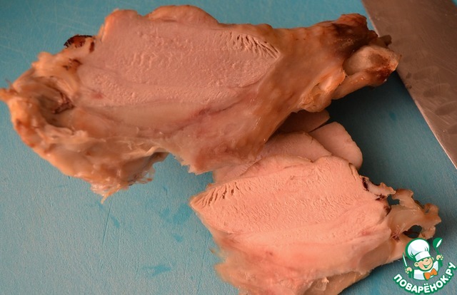Заранее отварить и полностью охладить крыло индейки.