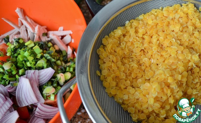 Чечевицу отварить в 2 стаканах воды в течении 10 минут.