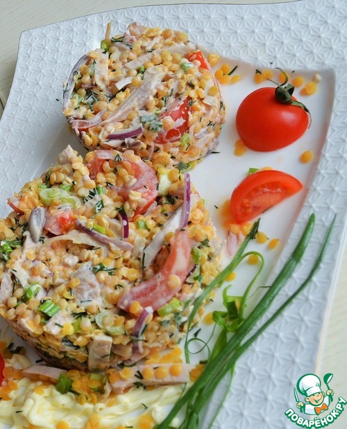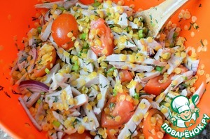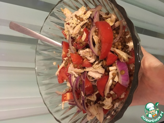 Соединить чечевицу с остальными продуктами и перемешать.