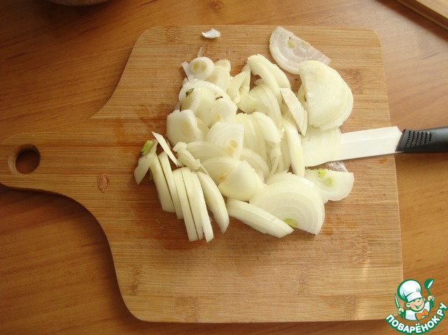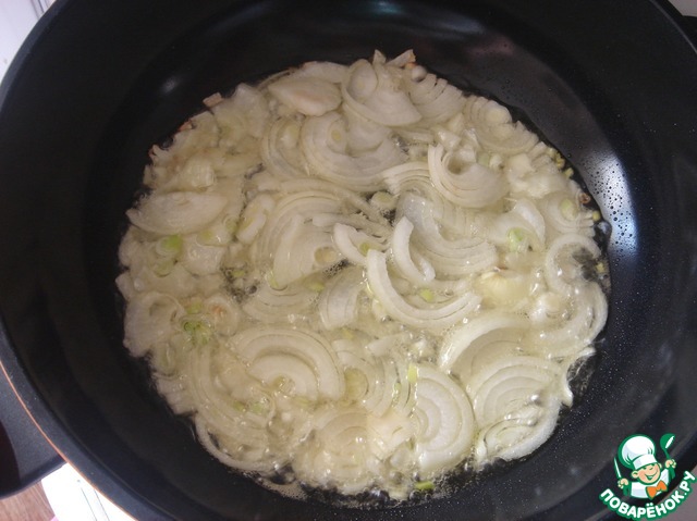 Берём подходящую посуду. У меня есть вок. Разогрела его с маслом и выложила лук. Важно! Масло нужно налить столько, чтобы лук им покрылся. У меня ушло 150 мл. Лук обжариваем до золотого цвета.