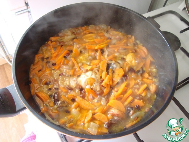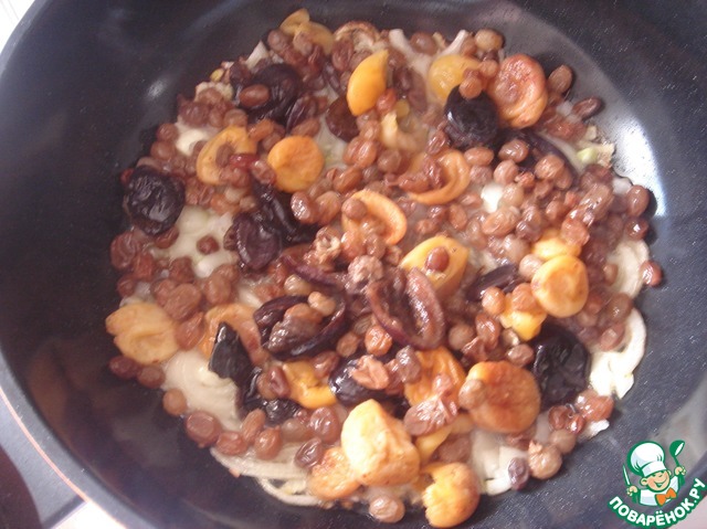 Выкладываем сухофрукты обсушенные и обжариваем их с луком на среднем огне.