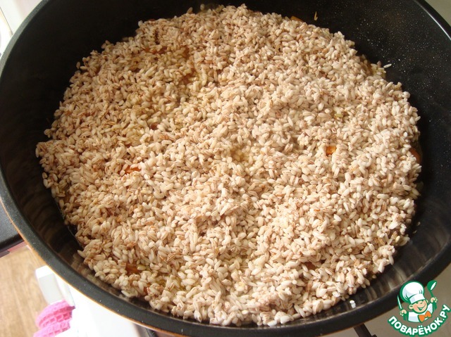 Пришло время риса. Выкладываем ровным слоем рис, предварительно вынув чеснок и стручок перца на тарелку. Делаем на среднем огне до полного впитывания влаги рисом. Это минут 15.
