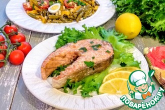 Тщательно завернуть рыбу в фольгу и выложить в форму для запекания. Отправить в духовку при 200 гр на 20 минут. Затем духовку выключить и оставить рыбу на 10 минут. Фольгу вскрывать и разворачивать не надо, чтобы не вытек сок и рыба не стала сухой. Подавать рыбу с любимым гарниром или овощами и зеленью.