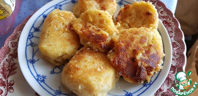 Моцареллу нарезать на кусочки. Взять столовую ложку пюре (руки смочить холодной водой), приплюснуть, положить в серединку кусочек или два моцареллы. Защипнуть края и придать форму цилиндра или шарика.