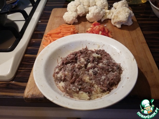 Пока фасоль варится, нарезаем мелко лук, морковь брусочками, цветную капусту разбираем на соцветия. Тушенку перекладываем в тарелку и мелко разминаем мясо вилкой или руками.