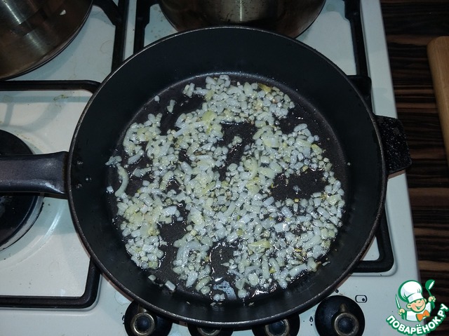 На сковороде обжариваем лук до золотистого состояния. Картофель нарезаем произвольно и добавляем в кастрюлю.