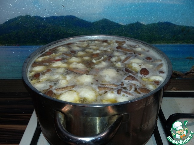 После этого добавляем опята в суп, перекладываем зажарку в кастрюлю, добавляем лавровый лист, перец чили хлопьями, душистый перец, соль по вкусу. Даем прокипеть примерно 5 минут, закладываем цветную капусту и сразу выключаем. Накрываем крышкой и даём настояться минут 20. После этого наливаем в тарелочку и приятного аппетита.