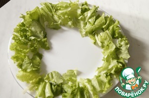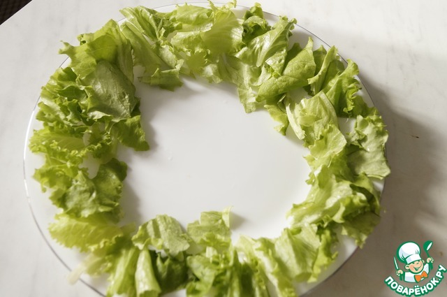 Листья салата промыть и обсушить. Порвать руками и выложить на край плоского блюда.