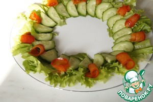 Огурцы нарезать сначала кружочками, затем еще пополам. Перец болгарский нарезать при помощи ножа для чистки картофеля. Выложить на салатные листья огурец и болгарский перец.
