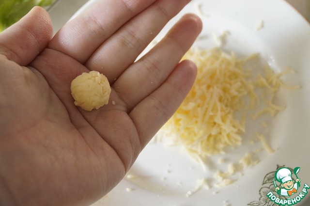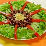 По внутреннему краю, где расположен огурец, выложить фасоль. В центр поместить шарики из сыра. Между половинками огурца поместить маленькие веточки укропа. Посыпать толченым арахисом.