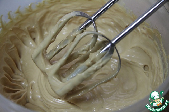 Пока кексы остывают, приготовим крем. Все компоненты крема должны быть комнатной температуры. Взбить сыр с вареным сгущенным молоком.