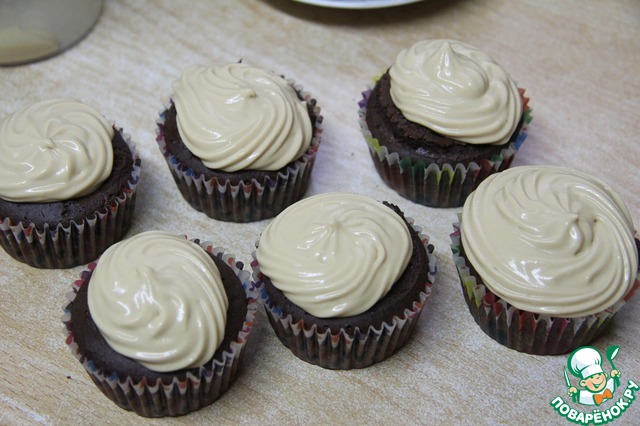 Из остывших кексов удалить серединку и наполнить этим кремом или другой начинкой. Я использовала охлажденный (сутки в холодильнике) шоколадный соус из рецепта "Блинчики по-Будапештски". Очень выигрышный вариант!!! Я поняла, что этот соус - находка. После холодильника он становится по консистенции как пластилин. Очень вкусный!!! Ему можно найти множество достойных вариантов применения ;-)
