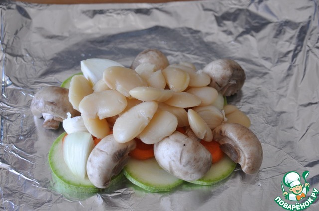 • Количество ингредиентов рассчитано на 2 порции. Берём фольгу, складываем вдвое, чтобы не порвалась и не вытек сок. Делаем порционную подачу - два куска фольги.