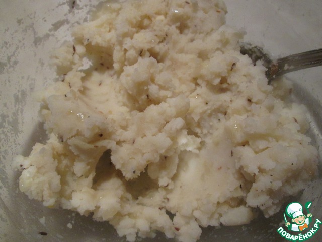 Пока тесто созревает, займемся начинкой. Картофель отварите в мундире, остудите, почистите, растолките в пюре. Очистите лук и чеснок, мелко порежьте. На разогретой сковороде обжарьте сначала лук до золотистого цвета, добавьте чеснок и зиру, перемешайте, снимите с огня. Смешайте картофельное пюре с жаренным луком.