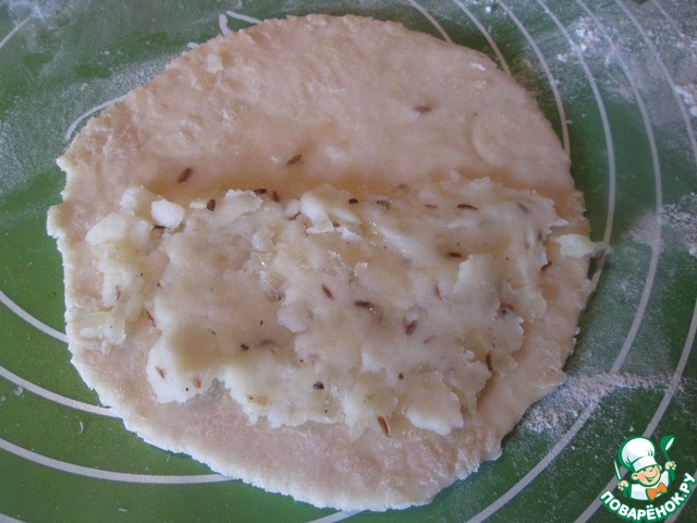 Выстоявшееся тесто разделите на десять кусочков, подкатайте их в шарики. каждый шарик раскатайте в лепешечку примерно 15 см в диаметре. На половину лепешки, не доходя примерно 5 мм. до края, положите начинку.