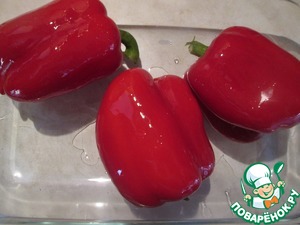 Разогрейте духовку до 220 градусов. Смажьте перцы растительным маслом и уложите их в форму для запекания. Запекайте, пока кожица не потемнеет. переложите перцы в пакет, пусть хорошенько " пропотеют ".