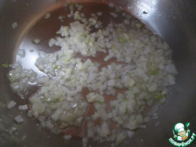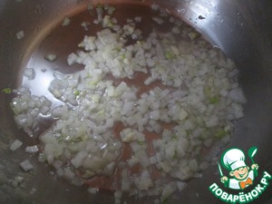 Лук и чеснок очистите, порежьте мелкими кубиками, обжарьте в кастрюле на растительном масле.