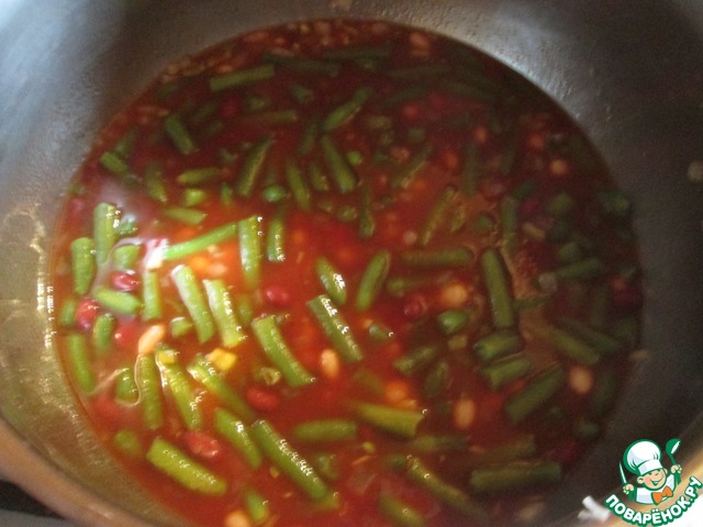 Влейте к луку и чесноку томатный сок, доведите до кипения, добавьте все виды фасоли, долейте горячей воды до желаемой консистенции. Мне потребовалось примерно 700 мл. Посолите и поперчите по вкусу, добавьте мелко порезанный перчик чили. Снова доведите до кипения и выключите. Подавайте с зеленью.
