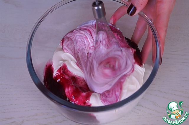 7. Тем временем готовим крем: сметану взбиваем с черникой в однородную массу