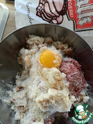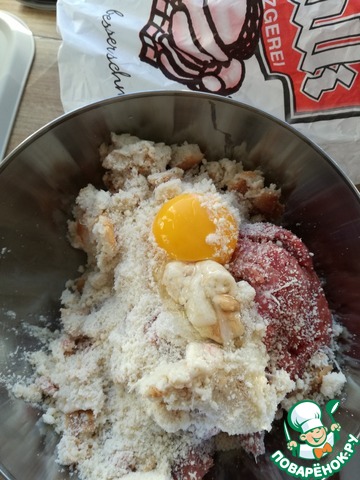 В миску выкладываем фарш, размягченные в воде или молоке тосты, натертый пармезан, мелко рубленный чеснок, тщательно перемешиваем.