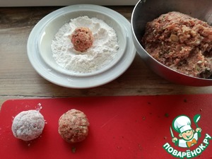 Скатываем круглые шарики, обваливаем в муке и выкладываем в разогретую с ол. маслом сковороду.