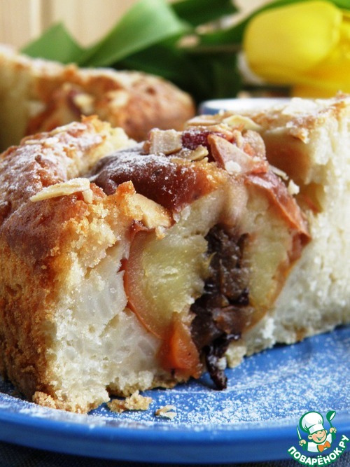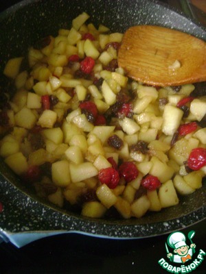 В расплавленный сахар выложить нарезанные мелкими кубиками яблоки, груши, айву – все, что есть. Добавить замоченные и промытые сухофрукты – у меня изюм и вялена вишня. Перемешать и томить на маленьком огне до размягчения.