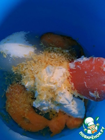 Соединяем творог, сахар, растительное масло, молоко, ванильный сахар, яйца, лимонную цедру и хорошо взбиваем миксером.