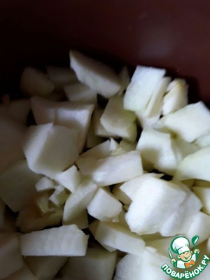Моем, чистим и нарезаем яблоки на небольшие пластинки. Если яблоки твердые нарезаем помельче.