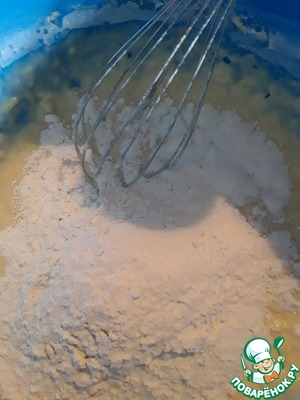 Добавляем к жидкой основе половину муки смешанную с разрыхлителем и тщательно все взбиваем.