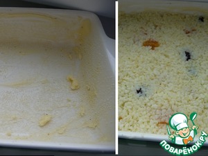 Стеклянную или керамическую прямоугольную форму размером 18х12 см, глубина 4 см смазать сливочным маслом, обсыпать манной крупой. Выложить пшенную массу и разровнять.