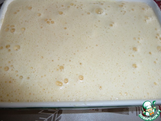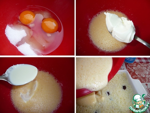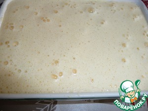 • Яица взбить с сахаром и ванильным сахаром до светлого пышного состояния, добавить сливочный сыр, сливки и взбить. Залить пшено.