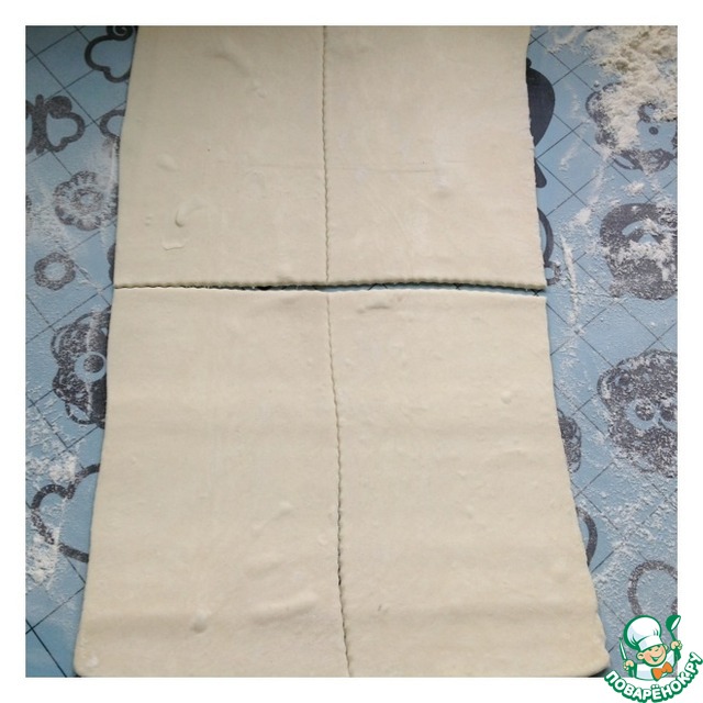 Тесто предварительно разморозить. Раскатать тесто не очень тонко, чтобы у вас с одного пласта теста получилось 4 прямоугольника.