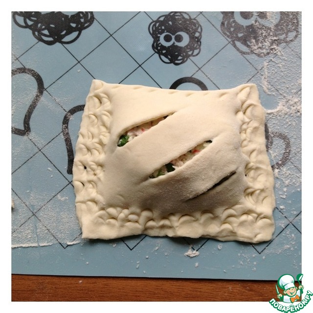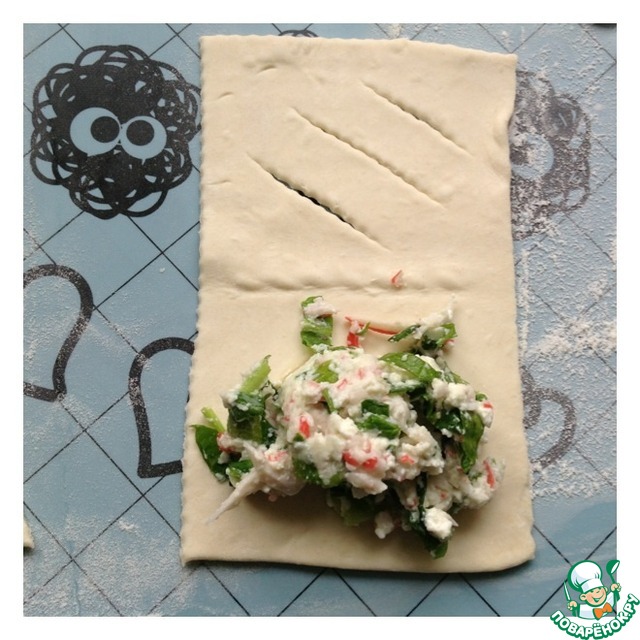На одной стороне прямоугольника сделать 3 надреза как на фото. На вторую половину прямоугольника выложить начинку.