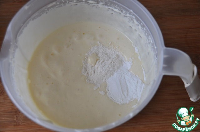 Добавляем к взбитым яйцам масляно-шоколадную суспензию. Перемешиваем. Добавляем муку и кукурузный крахмал. Тщательно перемешиваем венчиком.