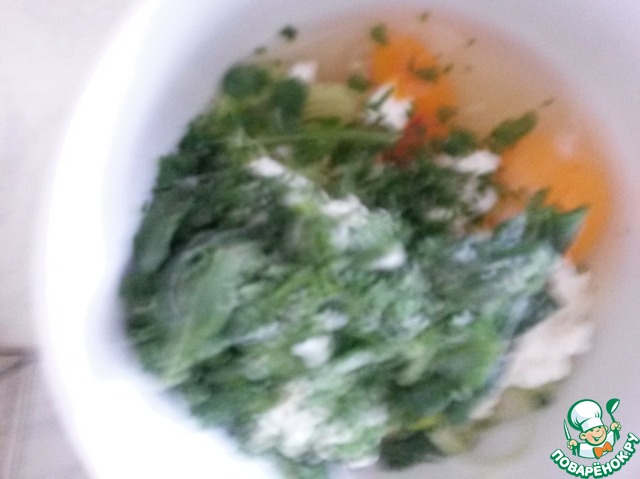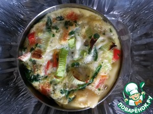 В яйца добавляем нарезанные овощи, шпинат можно свежий или замороженный, взбиваем венчиком до пышной пены