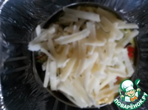 Отправляем в духовку еще на 10 минут, достаем, освобождаем от кольца, сверху еще посыпаем немного сыра и подаем.