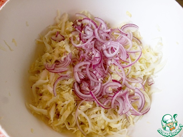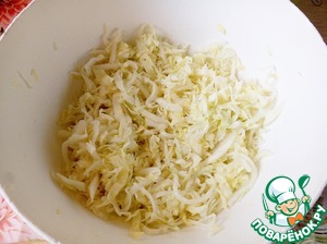 Капусту нашинковать, приправить сахаром и солью, помять руками.