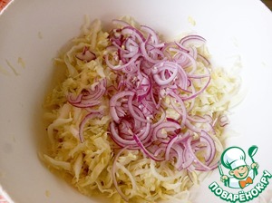 Лук нарезать полукольцами, добавить к капусте.