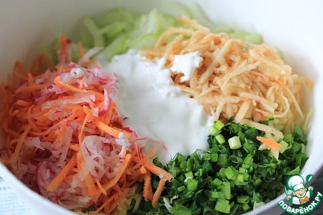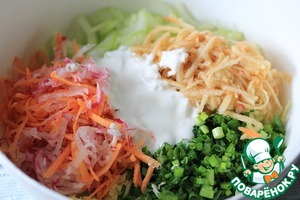 Морковь, редис и яблоко натереть на крупной тёрке и добавить в салат.